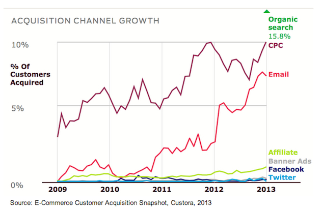 Email remains a significantly more effective way to acquire customers than social media — nearly 40 TIMES that of Facebook and Twitter combined (see above).